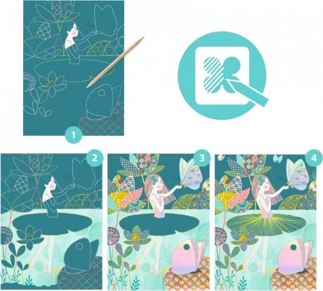 Entdecken Sie die Magie des Gestaltens mit dem Set aus Kratzbildern von DJECO. Nach dem sanften Abkratzen der Deckschicht erscheint eine wunderschöne Seenfee mit ihren Freunden. Das Set ist ideal für kreative Entspannung und fördert die Feinmotorik – ein Vergnügen für Kinder und Erwachsene.