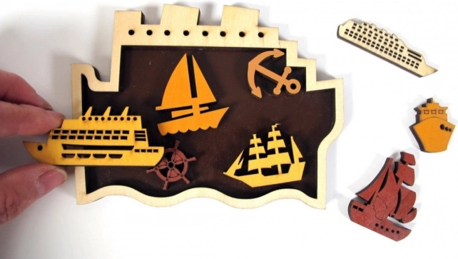 Farbige Holzteile in Form von Schiffen, Anker oder Steuerrad in den exakt definierten Bereich einpassen. Ideal zum Trainieren von Logik und Feinmotorik.