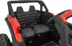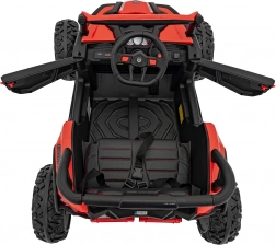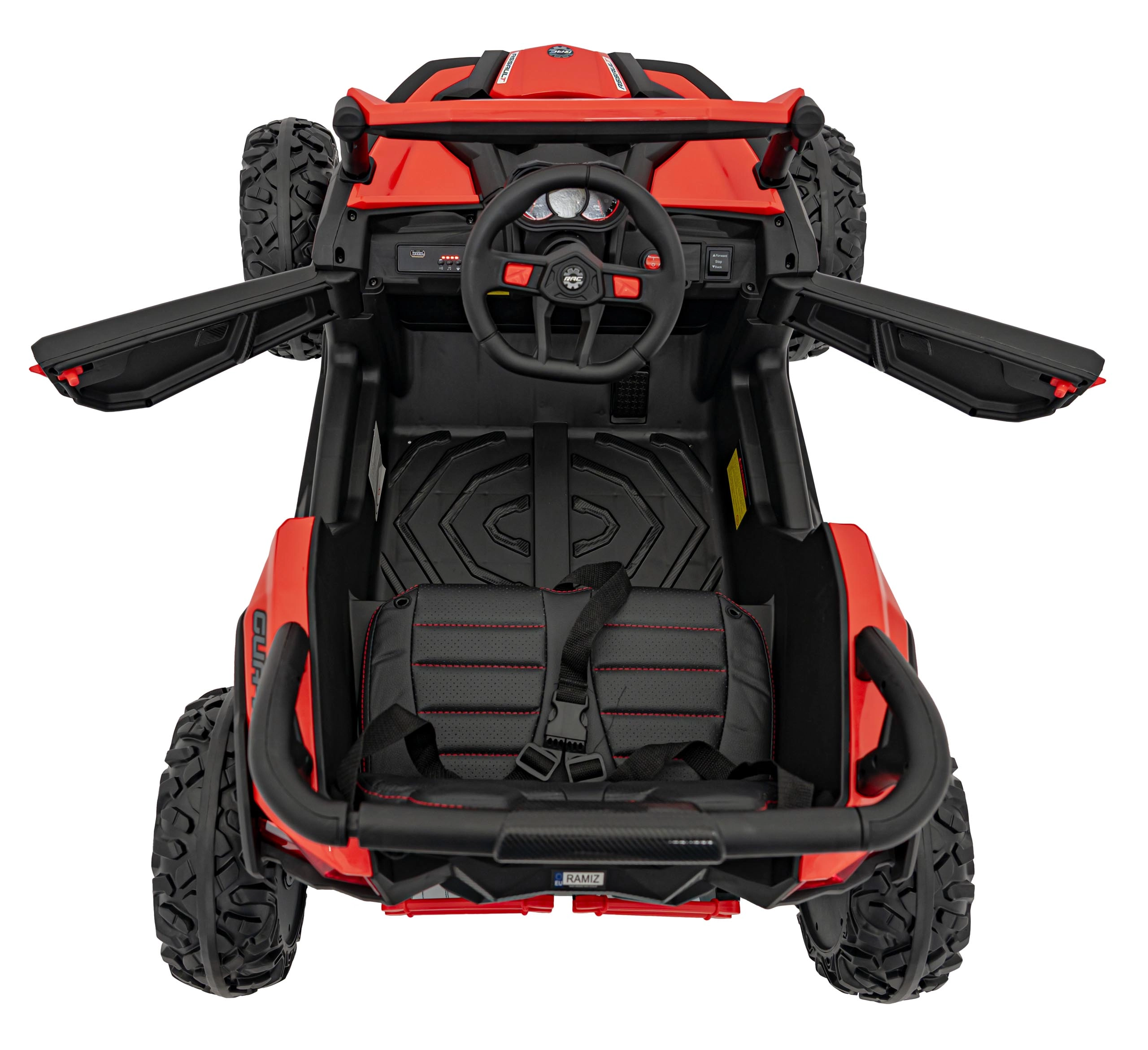 Dieses rote Geländefahrzeug für Kinder ist gemacht für Abenteuer im Garten und auf unbefestigten Wegen. Die Kombination aus 4x4-Antrieb, vier 4×35 W-Motoren und weichen EVA-Rädern gewährleistet hervorragenden Grip, leisen Betrieb und Stabilität. Hintere Stoßdämpfer glätten Unebenheiten, und die Bodenfreiheit von 20 cm hilft, kleinere Hindernisse zu überwinden.