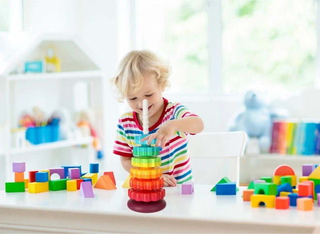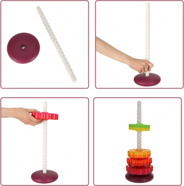Dieser farbenfrohe Spiralturm vereint Bewegung, Farben und Texturen zu einem einzigen, unterhaltsamen Spielerlebnis. Kinder stecken die gezahnten Ringe auf die spiralförmige Kunststoffstange, beobachten ihre Rotation und nehmen die leisen Geräusche beim Hinabgleiten wahr. Das Spiel fördert die Auge–Hand-Koordination, das Verständnis von Ursache und Wirkung sowie das Sortieren nach Größe und Farben.