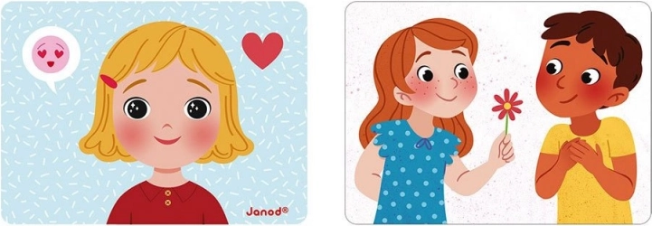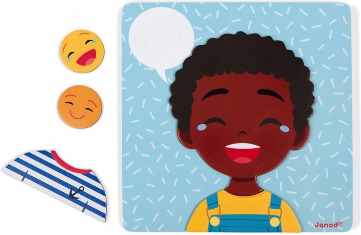 Emotionen und Gefühle – Dieses magnetische Spiel hilft Kindern, Emotionen mithilfe illustrierter Karten zu erkennen, die verschiedene Lebenssituationen darstellen. Auf jeder Karte ist ein Gesicht abgebildet, das die auf der Rückseite der Karte gezeigte Situation emotional nachahmt. Mit Hilfe der Magnete kann das Kind versuchen, die einzelnen Gesichtsausdrücke der jeweiligen Situation zuzuordnen. Es gibt 2 Spielstufen: Jüngere Kinder ahmen einfach den Gesichtsausdruck auf der Karte nach, ältere Kinder können versuchen zu erraten, welche Emotionen zu der jeweiligen Lebenssituation passen. Ein Spiegel ermöglicht es dem Kind, die einzelnen Ausdrücke nachzuahmen. Lieferumfang: - 1 Holztafel - 27 Magnete (10 Gesichter, 10 Smileys, 7 Kleidungsteile) - 20 Karten, die die jeweilige Lebenssituation zeigen. Geeignet für Kinder ab 2 Jahren.