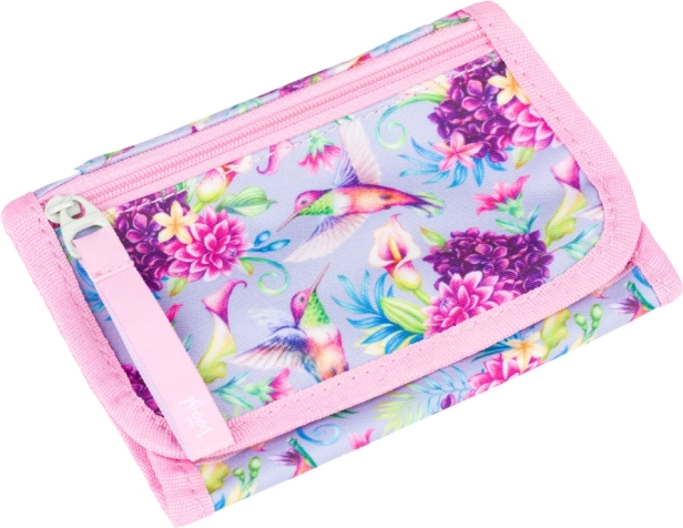 Die Börse besticht durch ein schönes Muster aus Blumen und Kolibris, das Aufmerksamkeit erregt und jedem Outfit Stil verleiht.