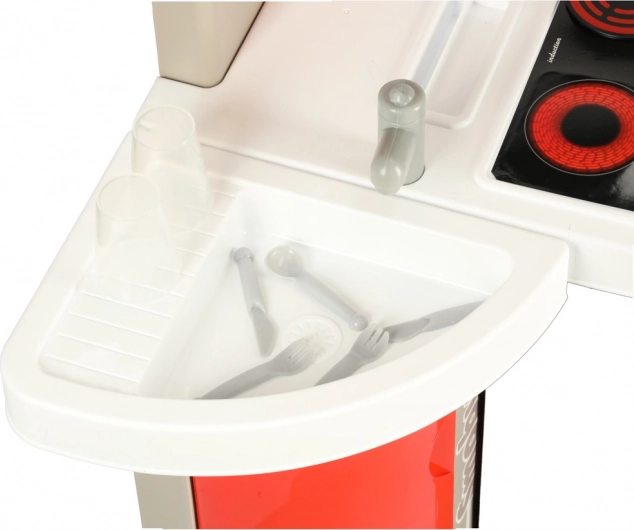Diese kompakte, platzsparende Küche entführt Kinder in die Welt des echten Kochens. Dank der elektronischen Effekte der Kochplatten mit Koch-Imitation und den drehbaren Knöpfen mit charakteristischem „cric-crac“-Geräusch wirkt das Spiel noch realistischer. Praktische Ablagen und Abtropfgitter halten sämtliches Zubehör griffbereit.