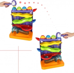 Die bunte, unterhaltsame 3-in-1-Kugelbahn für Kinder ab 3 Jahren bietet zwei separate Strecken – eine für Kugeln und eine für das Auto. Mit dem Hammer lassen Kinder die Kugeln aus den oberen Öffnungen starten und beobachten ihre Fahrt nach unten. Das Spiel fördert die Feinmotorik, die Hand-Auge-Koordination und erklärt spielerisch die Prinzipien der Schwerkraft. Enthalten sind 4× Kugel, ein Auto und ein Hammer.