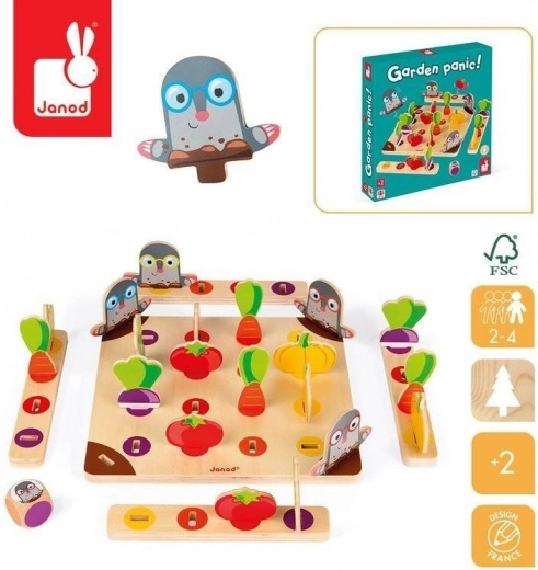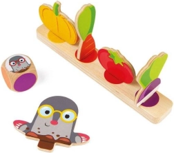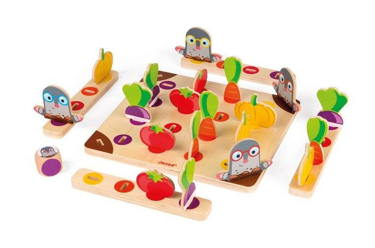 In diesem Holz-Gesellschaftsspiel schlüpfen die Spieler in die Rolle von Gärtnern: Auf dem Spielplan wachsen farbenfrohe „Beet“-Tomaten, Karotten, Kürbisse und Rote Bete, in den Ecken lauern Maulwürfe. Ihr würfelt – die Farbe steht für das Gemüse, das ihr in euren Korb legt; der Maulwurf stoppt eure Ernte vorübergehend. Gewinnt, wer als Erster je ein Stück jeder Gemüsesorte gesammelt hat.