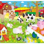 Bauen Sie zu Hause einen bunten Bauernhof mit Kuh, Ferkel, Schafen, einem Bauern im Traktor, einer Scheune und einem bestellten Feld. Das Set enthält außerdem acht spezielle Tier-Puzzleteile, die als Schablonen zum Zeichnen verwendet werden können – ideal für kreatives Spielen.