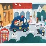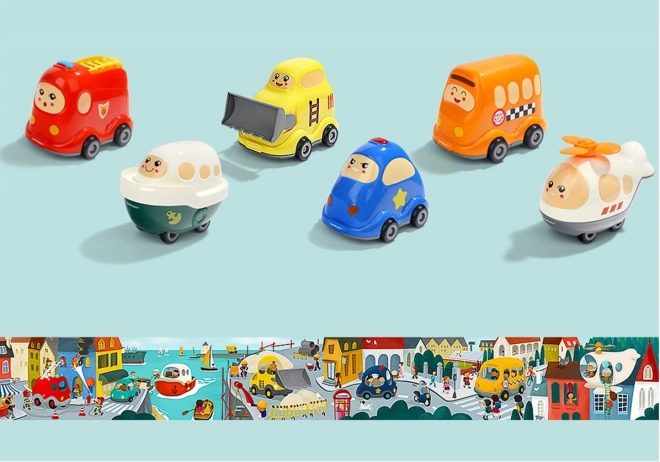 Holen Sie sich auch die anderen Fahrzeuge (Feuerwehrwagen, Schulbus, Bulldozer, Hubschrauber, Schiff). Die Randteile passen aneinander und ergeben ein langes Panoramapuzzle – und zugleich eine Sammlung fahrender Spielzeuge.
