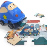 Das niedliche Polizeiauto mit Rädern hat auf der Unterseite einen aufklappbaren Deckel. Darin lassen sich alle 24 Holzpuzzleteile verstauen – so ist alles griffbereit und nichts geht verloren.