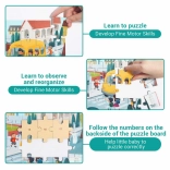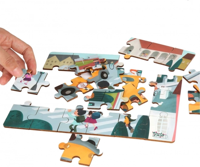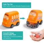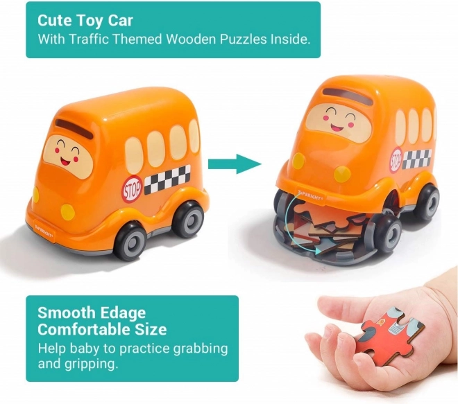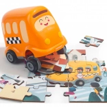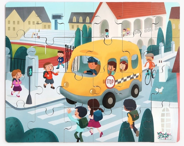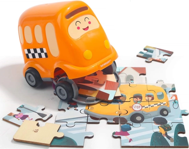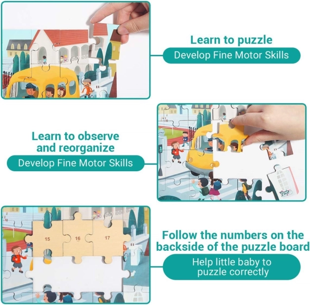 Entdecken Sie das clevere 2-in-1-Spielzeug: ein hochwertiges Holzpuzzle zum Thema Verkehr und ein Schulbus aus Kunststoff mit Stauraum. Die nummerierten Rückseiten der Teile helfen Kindern, das Bild Schritt für Schritt zusammenzusetzen, während sie Logik, Zusammenhänge und motorische Fähigkeiten trainieren.