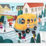 Die farbenfrohe Szene mit dem Schulbus und den Kindern fördert das Bewusstsein für den Verkehr und sicheres Verhalten am Zebrastreifen.
