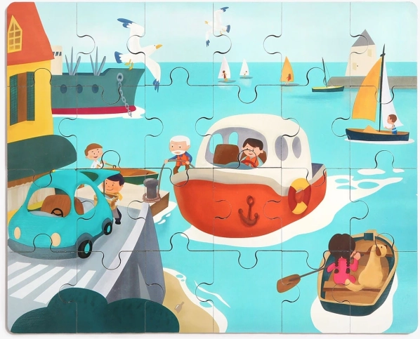 Dieses originelle 2-in-1 verbindet den Spielspaß mit Fahrzeugen und die Freude am Puzzeln. Das Holzpuzzle mit Verkehrsthema fördert Konzentration, Feinmotorik und logisches Denken. Das Boot ist ein eigenständiges Spielzeug auf Rädern und birgt innen einen sicheren Stauraum für Puzzleteile oder Kinderschätze.