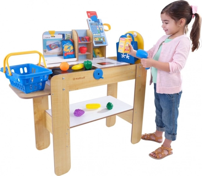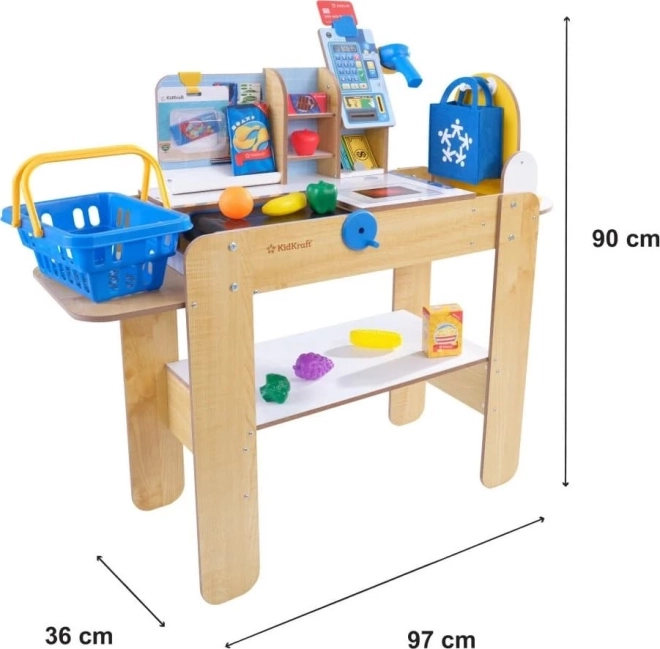 Das Set umfasst 30 hochwertige Zubehörteile (Lebensmittel, Korb, Kreditkarte, Tasche, Scheine und Münzen) sowie einen drehbaren Taschenständer wie im echten Geschäft. Die Holzkonstruktion von KIDKRAFT sorgt für Stabilität und Langlebigkeit – ideal für den täglichen Spielgebrauch.