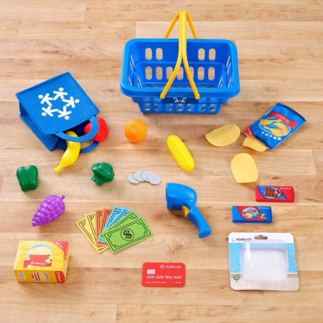 Inklusive Spiellebensmittel, Korb, Tasche, Kreditkarte und Spielgeld – alles für die vollständige Rolle als Kassierer oder Kunde.