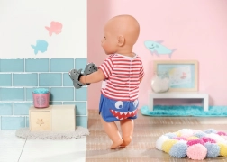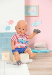 Gönnen Sie Ihrer Puppe ein stilvolles Einschlafen mit dem BABY born Pyjama im Ozean‑Look. Das rot‑weiß gestreifte T‑Shirt mit Hai und der blaue Unterteil mit Hai-Lächeln zaubern jedem kleinen Betreuer ein Lächeln ins Gesicht. Graue Schühchen in Haiform runden das Outfit perfekt ab und fördern fantasievolles Spiel.