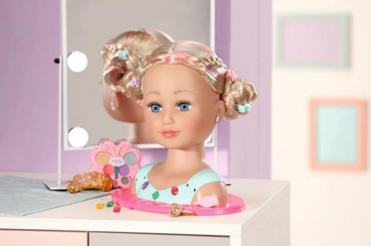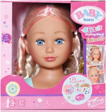 Willkommen im Kosmetikstudio für kleine Prinzessinnen mit Sinn für den besten Stil! Junge Make-up-Artistinnen können atemberaubendes Make-up mit einer farbigen und dermatologisch getesteten Make-up-Palette kreieren. Der Frisierkopf mit blonden Haaren in Premiumqualität und zarten farbigen Strähnen lässt sich leicht mit Haargummis, Spangen, Clips und einer Bürste stylen. Ob romantische Wellen, eleganter Dutt oder Zöpfe und Pferdeschwänze – der Fantasie königlicher Stylistinnen sind keine Grenzen gesetzt. Der Höhepunkt der Eleganz kommt in Form von leuchtend bunten, zum Anklicken geeigneten Diamanten, mit denen die glitzernde Krone oder die Bluse verziert werden kann. Das Einzige, was noch fehlt, sind großartige Ohrringe. Und jetzt ist die Prinzessin bereit, alle um sich herum zu verzaubern.• Make-up und Haare.• Sorgfältig gestaltetes Zubehör fördert die kindliche Fantasie und eröffnet neue Spielmöglichkeiten und -themen.• Für unterhaltsames und lang anhaltendes Spiel.Ältere Schwester BABY born Frisierkopf mit Make-up-Palette, Bürste, 4 Spangen, 8 Clips, 4 Haargummis, Krone und 14 anklickbaren Edelsteinen.