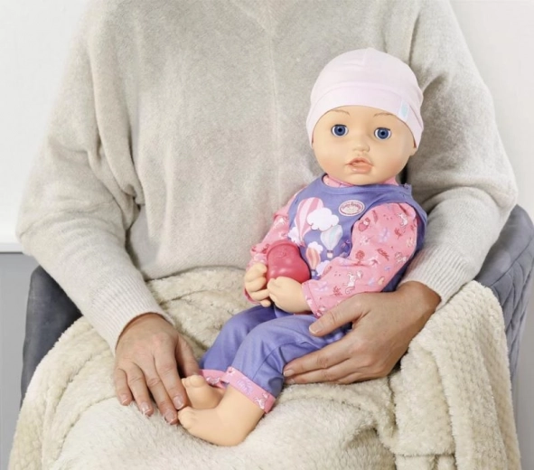 Die Puppe trägt einen niedlichen Overall mit Schäfchen-Print und eine rosa Mütze. Zum Zubehör gehört auch eine Flasche zum Füttern. Durch die Standardgröße kann man auch echte Babybekleidung verwenden – Umziehen und Outfit-Kombinationen werden so zum Kinderspiel.