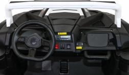 Der Innenraum bietet einen belüfteten Sitz aus Eco-Leder mit 3-stufiger Verschiebung und Sicherheitsgurten. Für Multimedia sorgt das Panel mit MP3/AUX/USB/Bluetooth, Motorstart-Sounds und Bedienelementen am Armaturenbrett. Den Überblick über die Energie liefert die Ladezustandsanzeige.