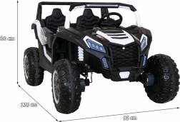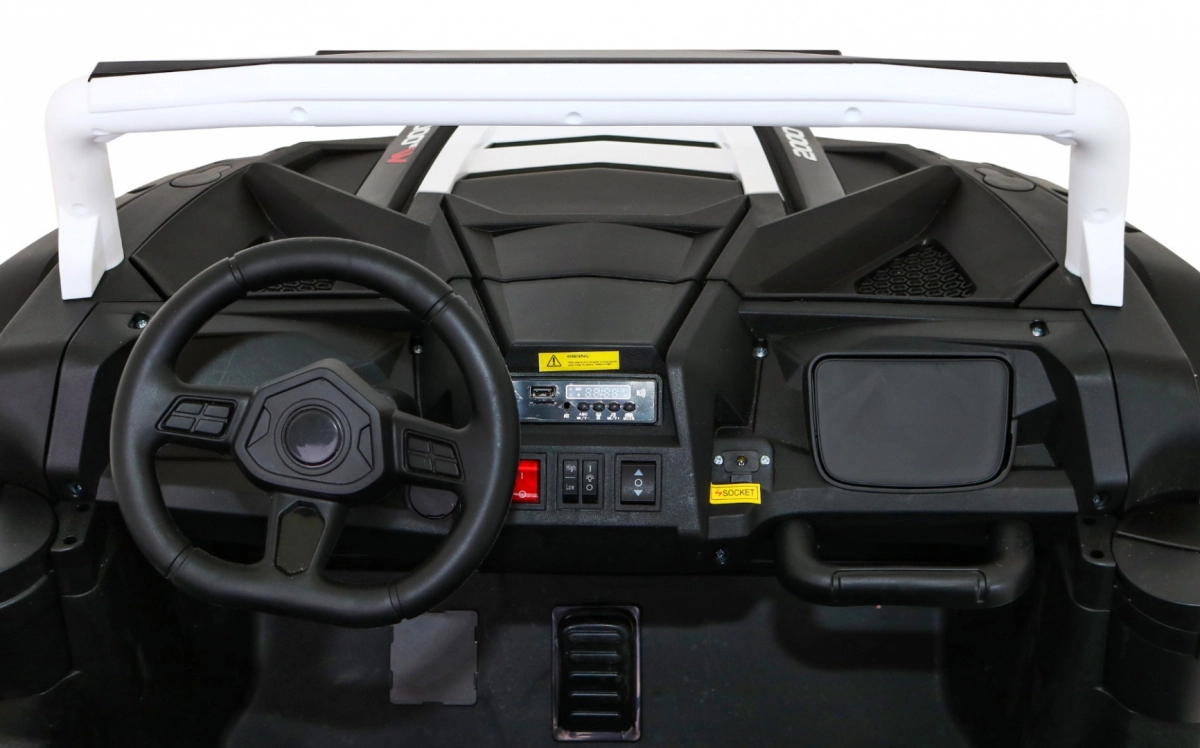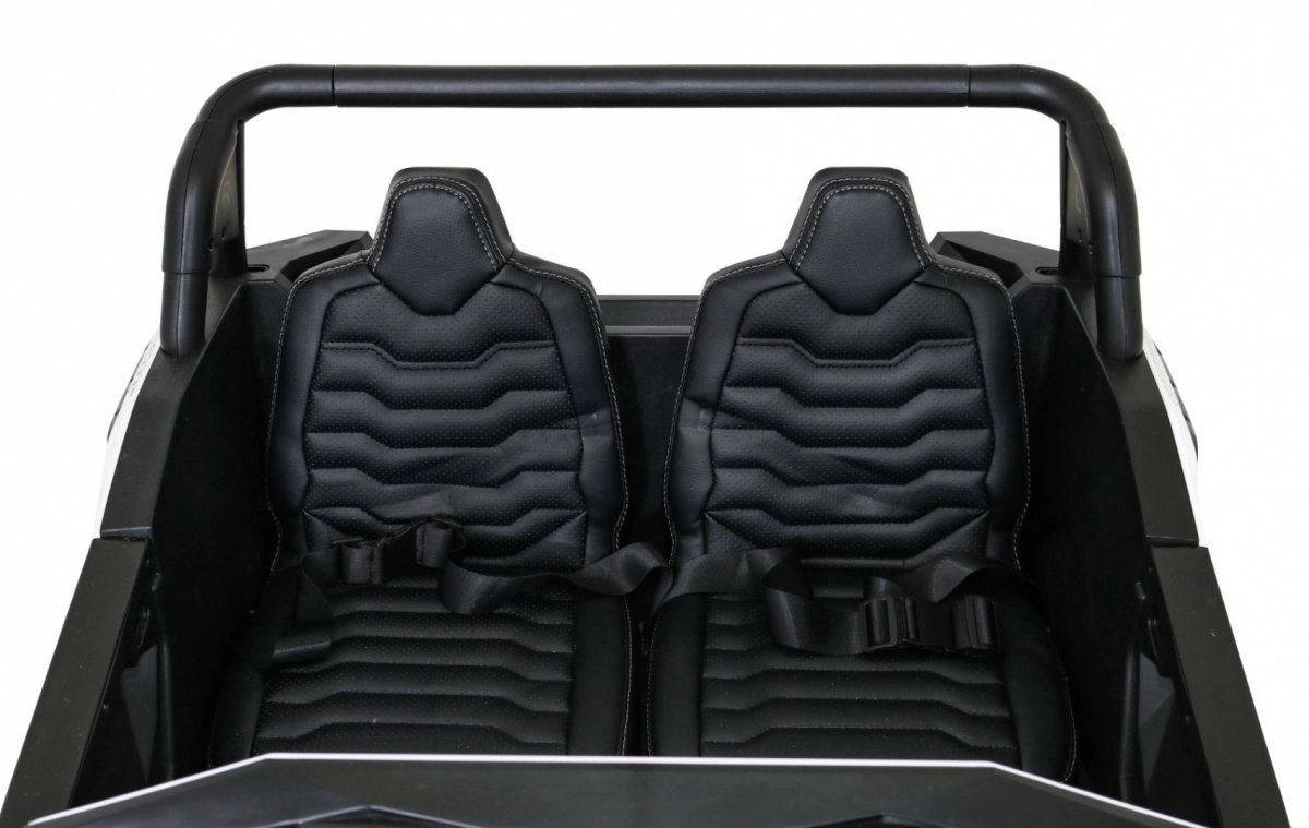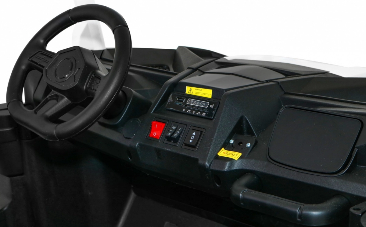 Leistungsstarkes elektrisches Kinder-Buggy für zwei Kinder mit Allradantrieb 4x4, 24V 7Ah Batterie und vier Motoren 4×200 W für eine gleichmäßige Fahrt auch im Gelände. Für Sicherheit sorgt die 2,4-GHz-Fernbedienung mit Stopp-Funktion und sanftem Anfahren. Komfort bieten der breite Ledersitz mit Gurten, EVA-Schaumreifen 35×15 cm sowie LED-Lichter vorne und hinten. Für Unterhaltung sorgt das Audio-Panel mit MP3/USB/AUX/Bluetooth und Sounds im Lenkrad.