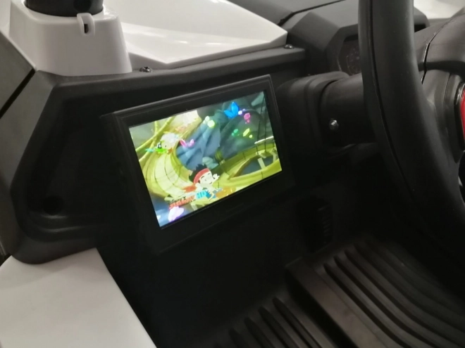 Das Bedienfeld enthält ein Lenkrad und ein kleines Display, das animierte Inhalte für eine multimediale Unterhaltung anzeigt.