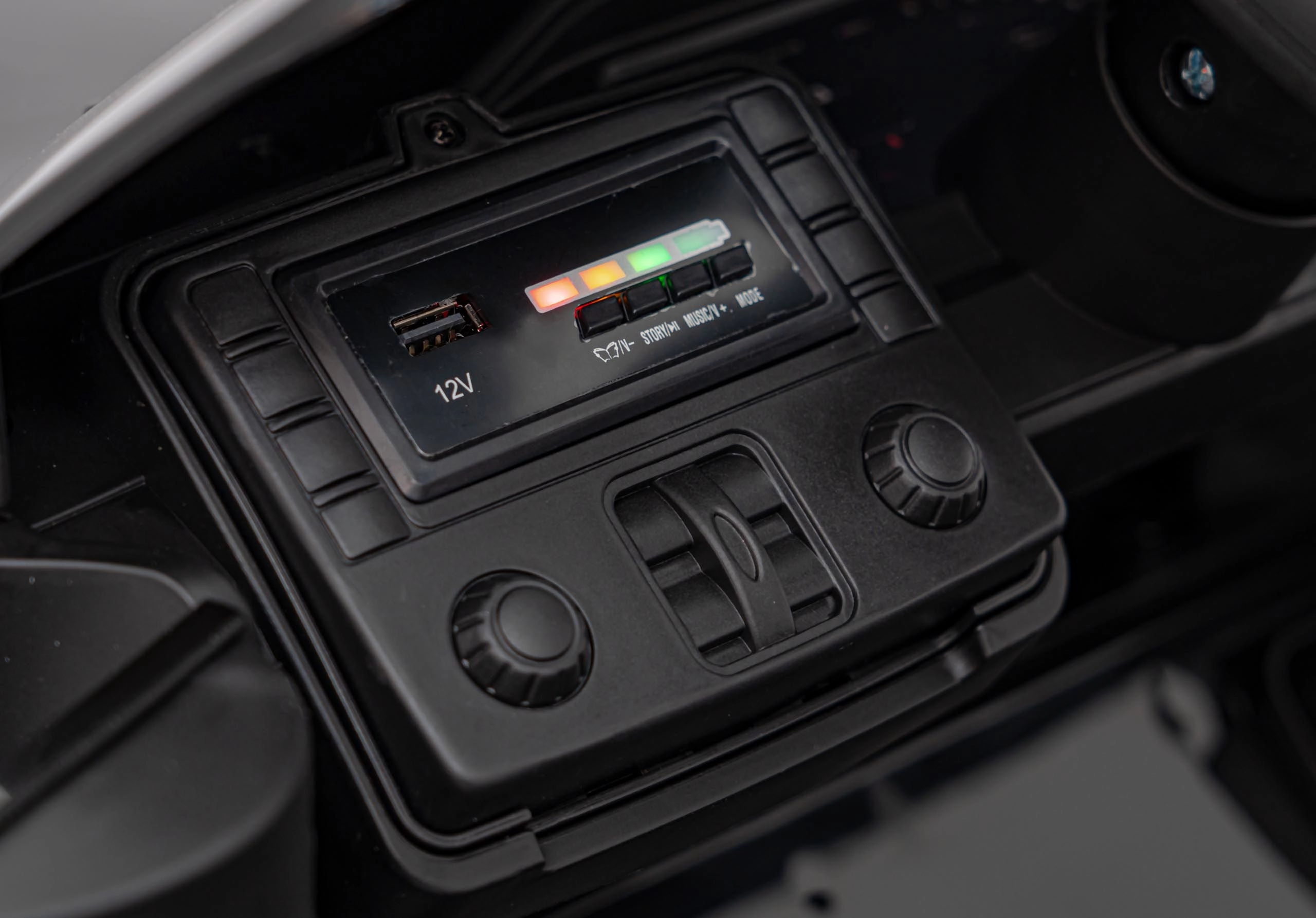 LED-Lichter vorne und hinten sowie ein Multimedia-Panel mit USB, Bluetooth, AUX und MP3 machen jede Fahrt zu einem unterhaltsamen Erlebnis.