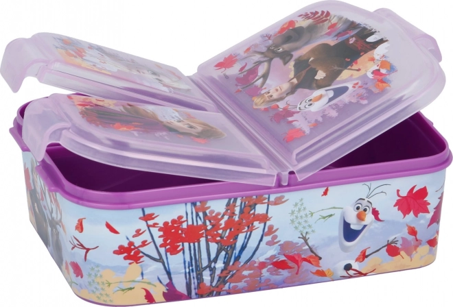 Die Kinder-Snack-Multibox mit offizieller FROZEN II-Lizenz überzeugt durch schönes Design und durchdachte Innenaufteilung. Drei separate Bereiche ermöglichen die Trennung von Obst und Gemüse, Sandwiches und kleinen Leckereien – so bleibt die Brotzeit den ganzen Tag frisch und übersichtlich.