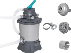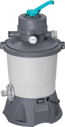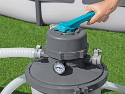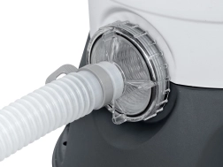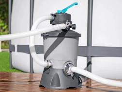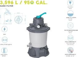 Dank der Kapazität von 3596 l/h ist die Pumpe ideal für Pools mit einem Volumen von 1.100 bis 18.100 Litern. Für den Betrieb wird eine Sandfüllung (Quarzsand #20, Körnung 0,45–0,85 mm, ca. 8,5 kg) oder hocheffiziente Polysphere™-Filterbälle mit einem Gewicht von ca. 240 g benötigt.