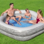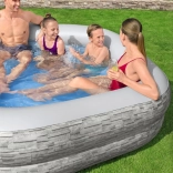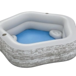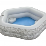 Dieser platzsparende Eckpool mit Steinmuster passt perfekt auf Terrasse und in den Garten. Widerstandsfähiges PVC und starke Wände sorgen für Langlebigkeit, während der weiche obere Rand zu bequemem Sitzen und Abkühlen an heißen Tagen einlädt. Dank des praktischen Ablassventils lässt sich der Pool nach dem Baden leicht entleeren.