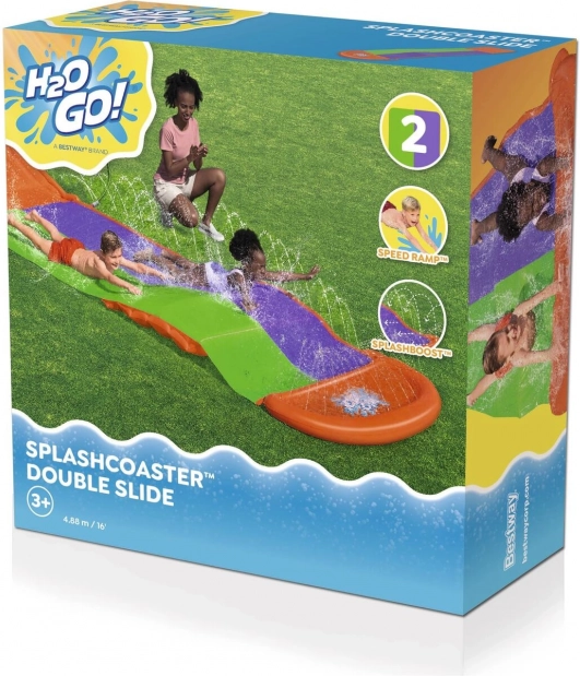 Die SplashCoaster-Rutsche von Bestway bringt Spaß in Ihren Garten! Dank der zweispurigen Rutsche mit einer Länge von 4,88 Metern ist sie ideal für Rennen und Gruppenspaß. Wasserfontänen sorgen für ein reibungsloses und schnelles Gleiten.