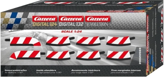 Praktisches Set innerer Randstreifen für die überhöhte Kurve 1/30° erweitert Ihre Strecke und erhöht die Stabilität der Modelle. Kompatibel mit den Rennbahnen CARRERA EVOLUTION, DIGITAL 132 und DIGITAL 124. Die Verpackung enthält 6 Stück mit Radius R1 für eine einfache Installation und einen sanfteren Kurvendurchlauf.