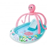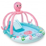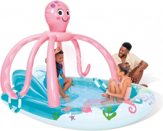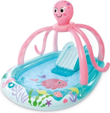 Das aufblasbare Wasserspielcenter Oktopus verwandelt Ihren Garten in ein kleines Meereskönigreich. Dank des integrierten Sprinklers mit Anschluss an den Gartenschlauch entsteht ein feiner Wassereffekt, den Kinder lieben, und die Rutsche ergänzt den Spaß mit sicherem Hineingleiten ins Becken. Die extra aufblasbare Bodenmatte erhöht den Komfort beim Sitzen und Spielen.