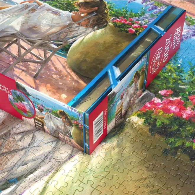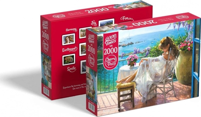 Entdecken Sie den Zauber einer stillen Auszeit am Meer. Das Puzzle von CHERRY PAZZI zeigt eine feine, künstlerische Szene einer Frau, die auf einer Terrasse mit Blick auf den Ozean entspannt. Mit 2000 sorgfältig gestanzten Teilen ist es ideal für Liebhaber anspruchsvollerer Herausforderungen und schöner Interieur-Motive.