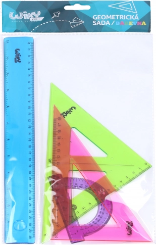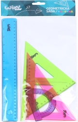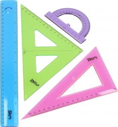 Praktisches schulisches geometrisches Set für den täglichen Gebrauch beim Zeichnen und Lernen. Enthält ein gerades Lineal 30 cm, einen kleinen Winkelmesser und zwei Geodreiecke in übersichtlicher, farbiger Ausführung für eine einfache Orientierung.