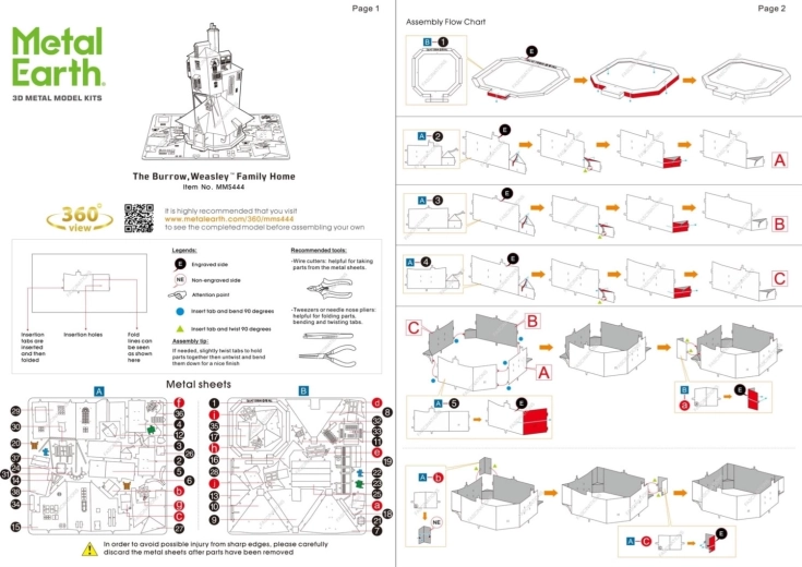 Entnehmen Sie die einzelnen Teile aus den Metallblechen; bei Bedarf verwenden Sie kleine Seitenschneider (nicht enthalten). Die Teile werden mithilfe von Verriegelungen verbunden, die aus einem Haken (Nase) und einer Öffnung bestehen. Biegen Sie die Nase mit einer kleinen Flachzange (nicht enthalten) um und verbinden Sie nach und nach alle Verriegelungen, bis ein sehr realistisches Meisterstück entsteht!