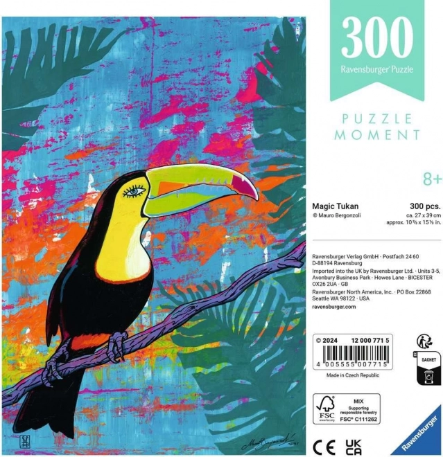 Entdecken Sie die Freude am Puzzeln mit dem RAVENSBURGER Puzzle Moment: Magischer Tukan. Dieses Set ist ideal für kurze Entspannungsmomente, in denen Sie abschalten und sich auf das schöne, farbenfrohe Motiv des exotischen Vogels konzentrieren möchten. Dank der hohen Verarbeitungsqualität und präziser Stanzung lassen sich die Teile leicht zusammensetzen und halten fest zusammen.