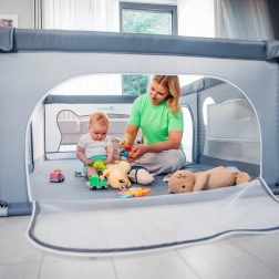 Laufgitter Lionelo Willow schafft eine sichere und geräumige Ecke zum Spielen und Ausruhen. Atmungsaktive Netzseiten sorgen für hervorragende Sicht und Luftzirkulation, die stabile Stahlkonstruktion mit Schaumstoffabdeckung schützt vor Stößen. Zwei seitliche Reißverschlusseingänge fördern die Selbstständigkeit größerer Kinder, während schnelles Zusammenklappen, geringes Gewicht und die Tragetasche Transport und Aufbewahrung erleichtern.