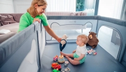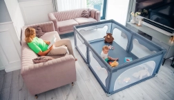Das Laufgitter bietet einen sicheren Spielbereich ohne störende Elemente im Inneren – alle Konstruktionsteile befinden sich außen. Weiche Netzseiten ermöglichen es dem Kind, Aufstehen, erste Schritte oder Drehen mit minimalem Risiko zu üben und bieten zugleich hervorragende Sicht für die Eltern. Höhere, stabile Wände verhindern ein unbeabsichtigtes Verlassen, sodass das Kind einen übersichtlichen und geschützten Bereich für den Alltagsspaß hat.