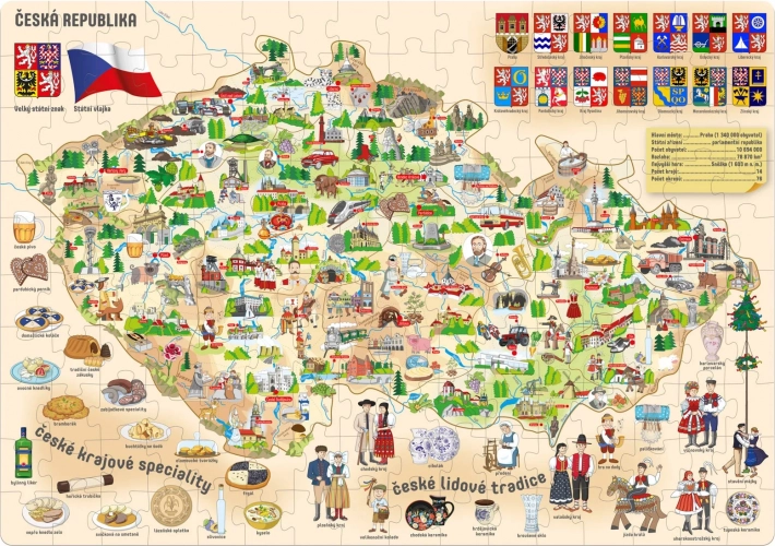 Entdecken Sie Tschechien spielerisch mit dem Kinderpuzzle einer Karte der Tschechischen Republik mit 160 Teilen. Illustrationen von Josef Záruba zeigen volkstümliche Traditionen, regionale Spezialitäten, Tiere und Pflanzen sowie Flagge und Staatswappen. Das Puzzeln fördert Wahrnehmung, Geschicklichkeit und Konzentration und unterstützt die kindliche Vorstellungskraft.