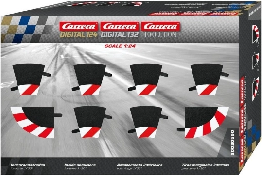 Verbessern Sie Ihre Rennstrecken mit inneren Randstreifen für die Kurve 1/30° (R1), kompatibel mit CARRERA Evolution, Digital 132 und Digital 124. Das Set enthält 6 Stück für stabilere Kurvenfahrten und ein realistischeres Streckenbild.