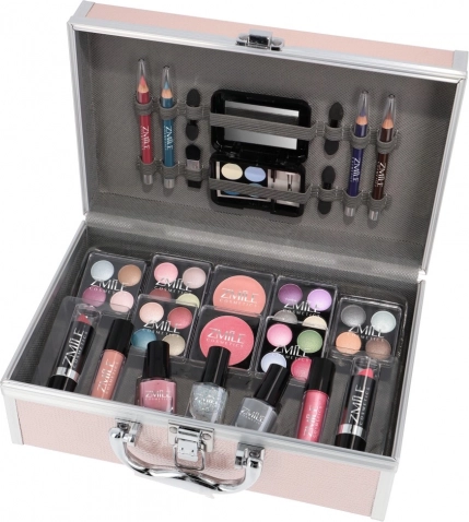 Kosmetikkoffer Rosa „Eye-Catcher“ mit integriertem Spiegel – insgesamt 42 Zubehörteile. Enthält 24× Lidschatten, 2× Nagellack, 1× Glitzer-Nagellack, 1× Rouge, 2× Lippenstift, 2× Lipgloss, 3× Kajalstift, 1× Eyeliner, 3× doppelseitigen Applikator, 1× Pinsel. Dermatologisch getestet, entspricht den strengen EU-Normen.
