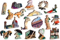 58 Spezialteile in Form von Tieren, Bauwerken und Gegenständen. Präziser Laser sorgt für scharfe Details und glatte, splitterfreie Kanten.