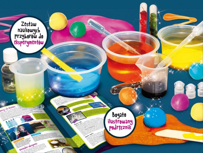 Ein faszinierendes und zugleich robustes Bauset, mit dem Kinder aus klebriger Masse lustige und kreative Dinge herstellen, darunter Springbälle, Monsterzellen, kinetischen Sand, ziehbares Gelee oder spaßige Knete. Das Produkt enthält sichere Reagenzien. Hinweis: Die Massen ändern ihre Farbe und springen! Inhalt: Schutzbrille, Pipette, Spatel, Reagenzien, Farbstoffe, Messbecher, Flasche, Reagenzgläser.