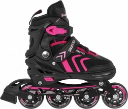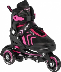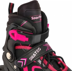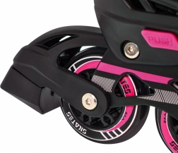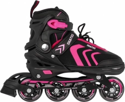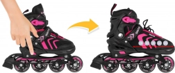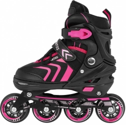 Komfort bietet die profilierte Einlage mit weichem EVA-Schaum, bezogen mit angenehmem Velvet-Material. Das dreifache Verschlusssystem – Schnürsenkel, Klettverschluss und Sicherheitsschnalle – hält den Fuß fest und zuverlässig. Das Aluminiumfahrgestell für die Rollen, PU-Rollen 64×24 mm mit Härte 85A und ABEC-7-Lager sorgen für eine ruhige und stabile Fahrt. Die Eiskufen aus Edelstahl sind pflegeleicht und bieten hervorragendes Gleiten.