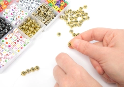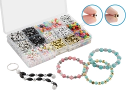 Set aus auffädelbaren Perlen mit ABC‑Buchstaben – das Set enthält 15 Arten von auffädelbaren Perlen mit Buchstaben. Aufbewahrt in einer praktischen Box mit Verschluss.