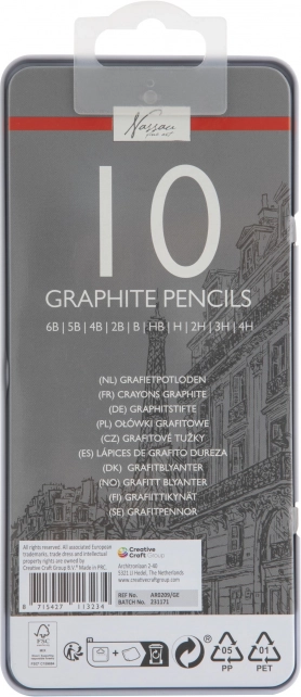 Das Set mit 10 Graphitstiften deckt den gesamten Bereich für kreatives Arbeiten ab: von weichen Stiften für satte Schatten und expressive Striche bis hin zu harten für feine Details und technische Linien. Das beiliegende Metalletui schützt die Stifte beim Transport und sorgt für Ordnung im Atelier und in der Schule.