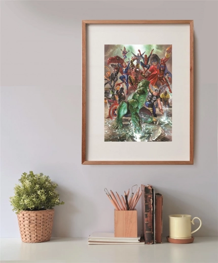 Die farbenfrohe Szene mit Superhelden kommt dank hochwertigem Druck und stabilem Karton besonders gut zur Geltung.