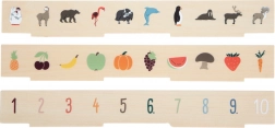 Cleveres Holzspielzeug für Kinder ab 3 Jahren, das Sortieren, Einlegen und Wortschatzlernen kombiniert. Enthält drei zweiseitige Tafeln und 60 Bildchips zu den Themen Verkehr, Tiere, Zahlen, Formen, Kleidung, Obst und Gemüse. Beim Spielen trainieren Kinder Feinmotorik, Farben- und Formerkennung und erweitern ganz natürlich ihren Wortschatz. Sichere Aufbewahrung bietet eine Holzbox mit 10 Fächern und Gummiband-Verschlüssen – ideal auch für unterwegs.