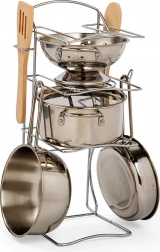 Mit diesem 8-teiligen Set erhalten Kinder die Möglichkeit und Werkzeuge für das pretentiöse Kochen. Es umfasst realistisch aussehendes Metallkochgeschirr, wie ein Sieb, eine Pfanne, zwei Töpfe mit Deckel sowie einen Holzlöffel mit Wender auf einem praktischen Ständer. Ideal zur Förderung von Kreativität, Sprachentwicklung und sozialen Fähigkeiten.