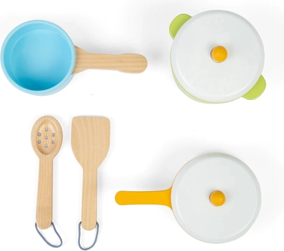 Beinhaltet 3 Töpfe, 2 Deckel und 2 Küchenutensilien, alles in Pastellfarben, die echtes Geschirr perfekt nachahmen.