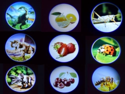 Diese Taschen-Projektionslampe verwandelt den Abend in spannende Erzählszenen. Drei austauschbare Scheiben bieten die Themen Dinosaurier, Insekten und Obst, jeweils mit acht Motiven – insgesamt 24 Bilder. Einfach eine Scheibe einlegen, durch Drehen das Motiv auswählen und auf eine glatte Oberfläche projizieren.