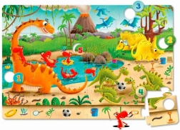 Aber das ist erst der Anfang des Spaßes. Dieses Puzzle trainiert nicht nur die Feinmotorik, sondern fördert auch Gespräche, bei denen dein Kind seinen Wortschatz erweitert, indem es beschreibt, was es auf dem Bild sieht, und einfache Fragen beantwortet. Das Suchen nach hervorgehobenen Objekten schult den Beobachtungssinn und prüft so die Aufmerksamkeit der Kinder; der Platz für die Spielsteine bei jeder Dinosauriergruppe hilft ihnen zudem, bis 5 zu zählen.